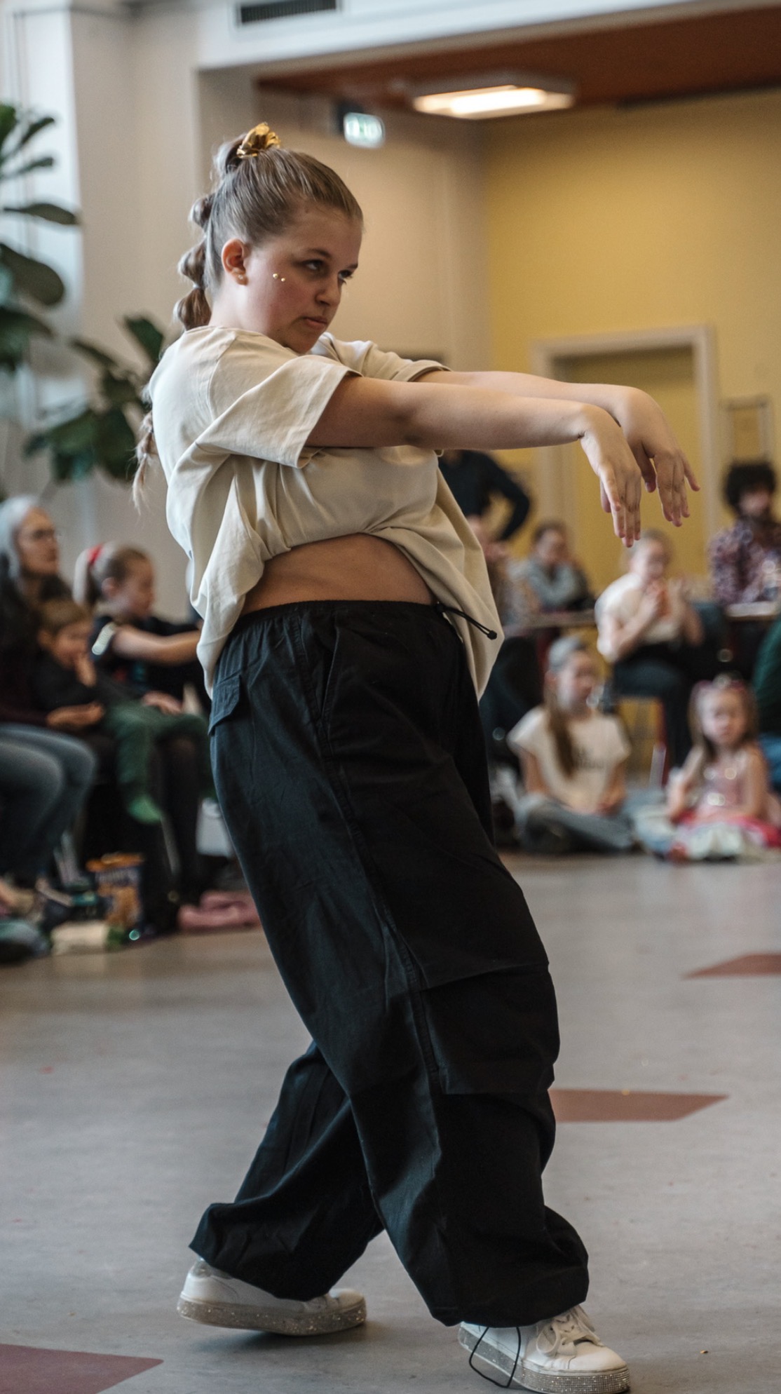 Når man ankommer indfinder man sig på sin plads (mors og fars købte siddepladser eller ståpladser). Dansebørnene sætter sig tit på gulvet rundt om selve dansegulvet og de finder hinanden med det samme tøj på. Programmet for rækkefølgen af danseshows findes overalt på stedet med vægopslag. Minutter inden, vi skal ind og optræde, så kalder jeg børnene sammen i et af hjørnerne af dansegulvet. Vi stiller os op, som vi har aftalt på danseholdene og så går vi ellers ind på dansegulvet, når det er tid.